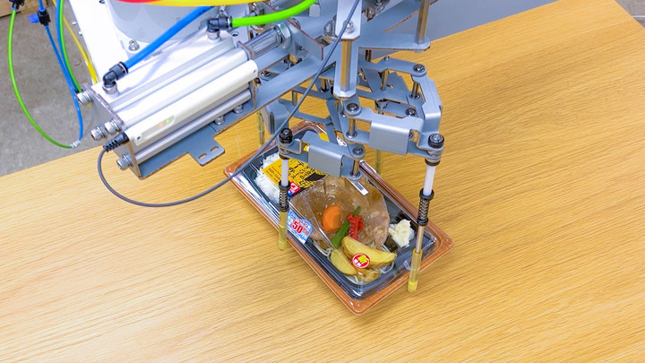 コンビニ商品はシュークリームのような潰れやすいものから、紙箱のように硬いものなど様々な物性を有していることに加え、最近のフィルムを剥がさず電子レンジで温められるお弁当などは多孔質フィルムに覆われており、従来のロボットハンドでは持つことができません。