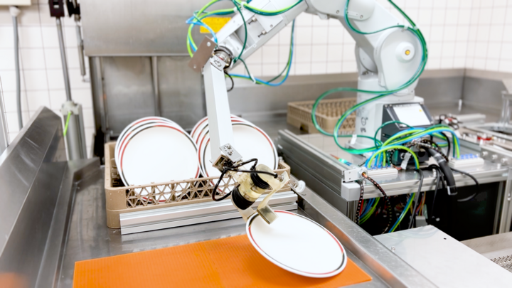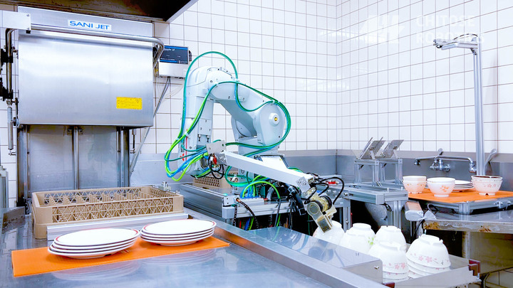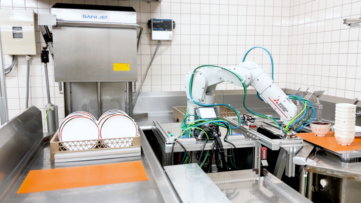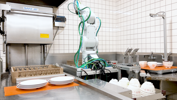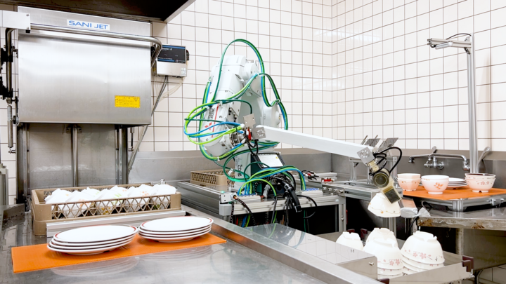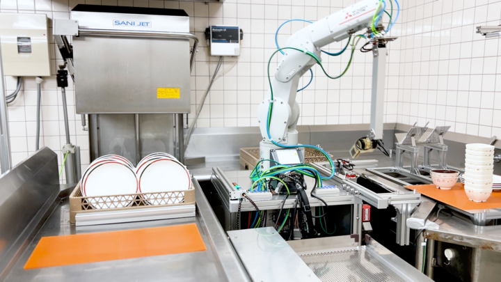 レストランの狭小洗い場においては、食器洗浄機の隣にロボットアームを1台設置します。写真右側が洗浄前食器を配置する戻し台であり、ホールスタッフが使用済み食器を客席から回収して積み重ねておきます。