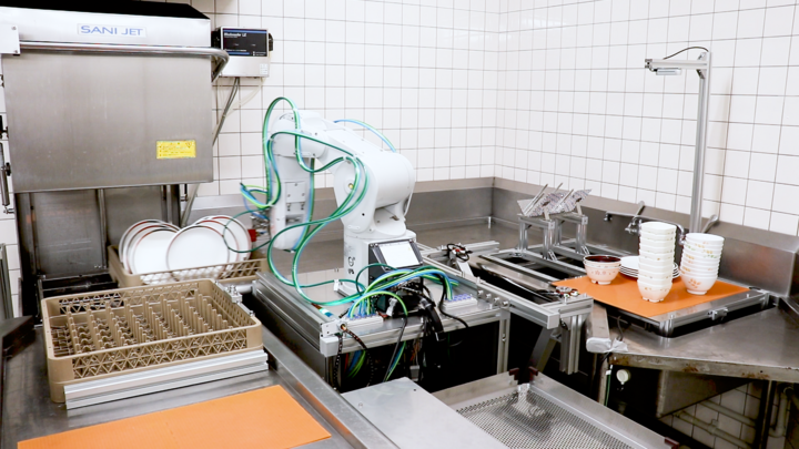 1台のロボットアームを狭小な洗い場に設置し、食器投入・ラック搬送・食器回収の作業を自動化することができました。