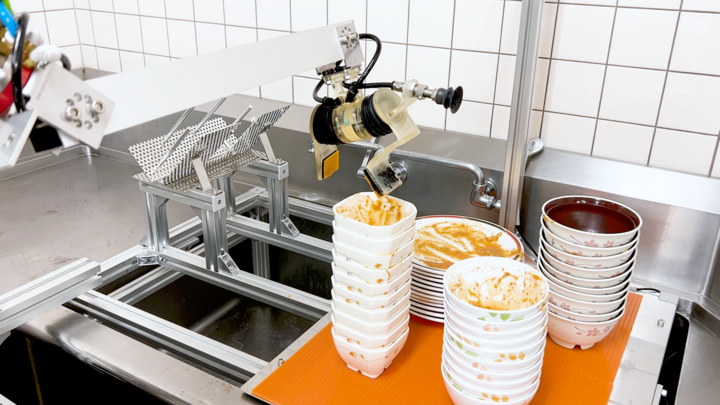 清潔なロボットハンドに取り替えたらラック上空に設置されたカメラで食器を認識し、つまんで持って食器棚にしまっていきます。